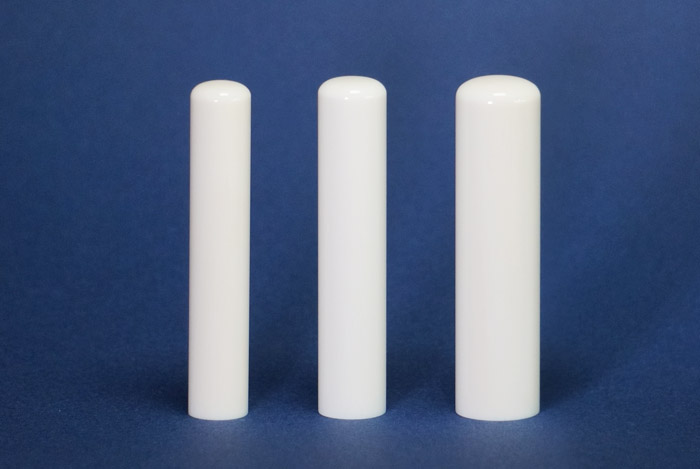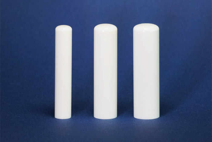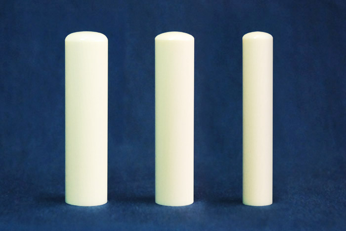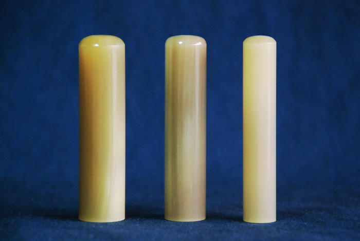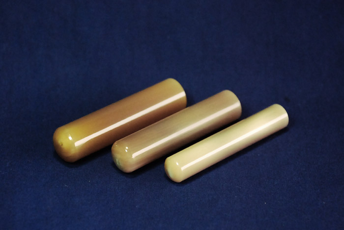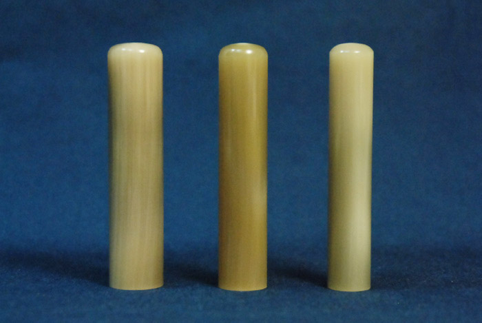 完全手彫り 印材は、牛の角の中心部(芯持ち)でまだらの無い白(純白)と言われる最高級印材です。