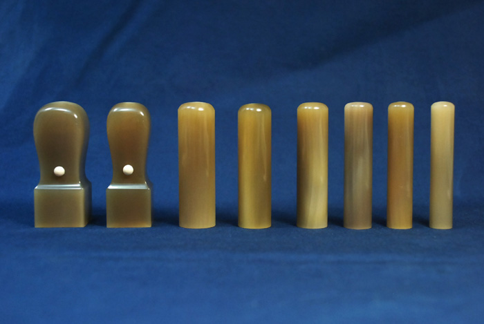 完全手彫り 印材は、牛の角の中心部(芯持ち)でまだらの無い白(純白)と言われる最高級印材です。