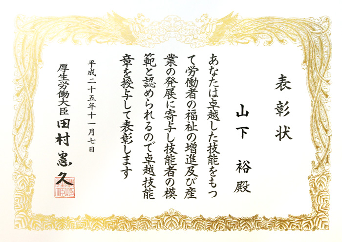 | 平成25年 | 厚生労働省 現代の名工 卓越技能賞 | |